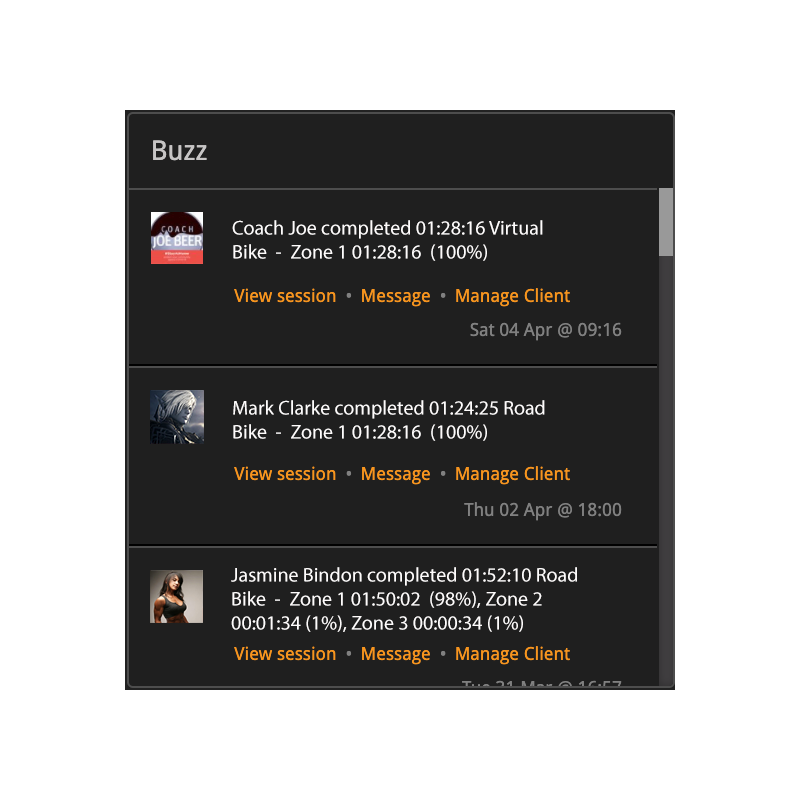 Drill down to view detailed information on any session, effortlessly update a training plan and communicate with clients without leaving the screen.
