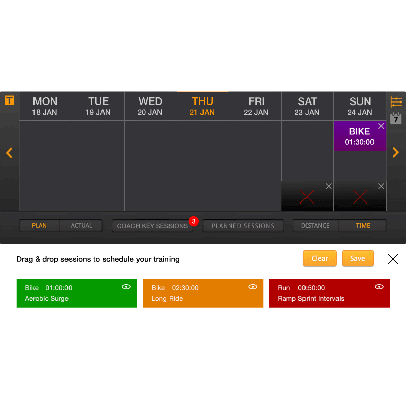Semi-auto or 'Tiptronic' mode delivers key weekly sessions to your clients and they choose when to schedule them in their calendar. The system automatically creates extra sessions, if they're needed to achieve their weekly target.